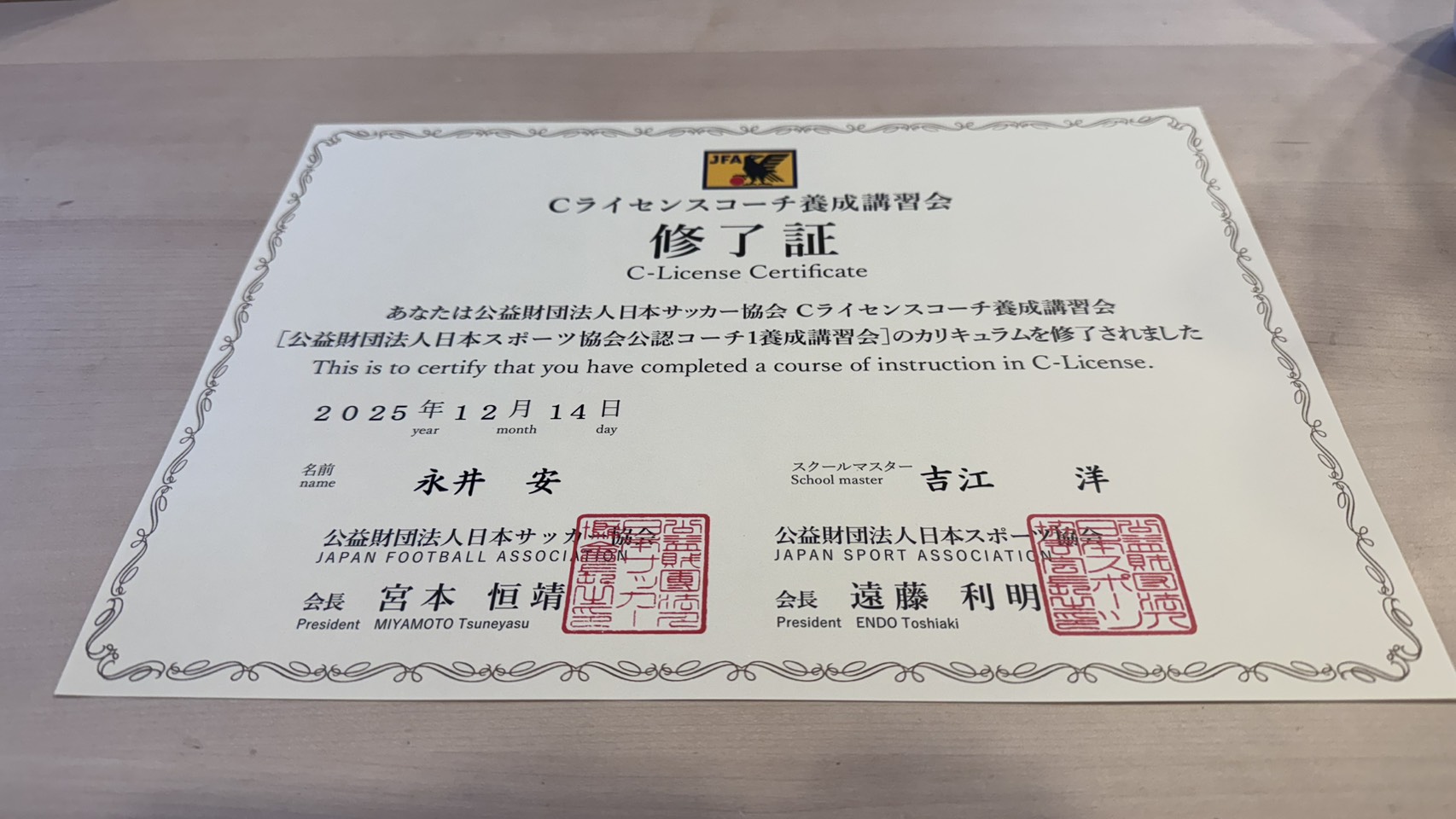 JFA公認C級コーチライセンスを取得しました。